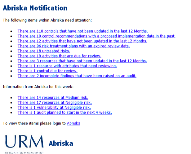 Many notifications are integrated into Abriska. When enabled, notifications are sent out by email on a weekly basis to relevant users. Which notifications are sent to which user roles is determined within Organisation Setup > Notification Setup. Notifications are either alerts or system information. Alerts are items that require attention and need to be resolved within the application.