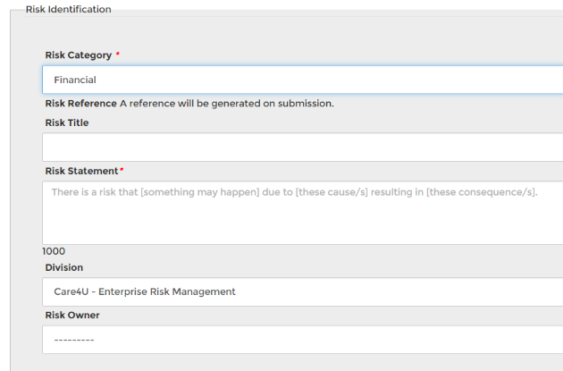 Used to identify and asses a risk to the business filling in the following information. You must select the Category first, this will then generate a Risk Reference.