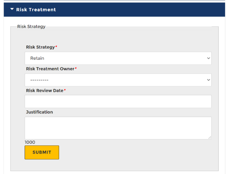 Risk Strategy (4 T's, AART or RAMS), Treatment Owner and Risk Review Date can be assigned to each risk identified by selecting the Risk Register and clicking on the Open Risk Detail arrow to the right of each risk entry within the register.