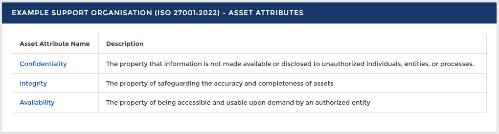 If Abriska is being used to conduct ISO 27001 compliant risk assessments, the option will be available to assess asset attributes. These attributes are used to ‘value’ an asset/resource in terms of its ‘Confidentiality, Integrity and Availability’. These values can be defined by clicking into ‘Assets’ from the organisation homepage, into an asset and 'Modify Asset Attributes'.