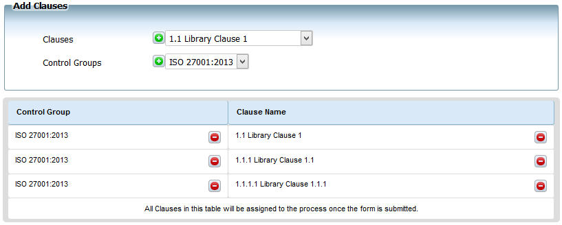 Once all the required controls are selected the submit option must be taken to assign the clauses to the process.