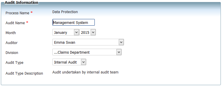 Additional audits may be scheduled and assigned to processes by selecting the Schedule and Audit Menu option. This option is available both from both the Audit Overview Page and the Audit Calendar.