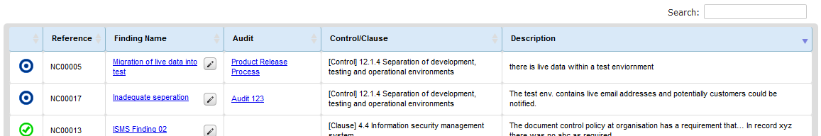 By selecting the Audit and Action Management >Audits>Audit Controls or the Audit and Action Management >Audits>Audit Clauses Menu a list of all the relevant clauses and controls will be displayed, showing whether findings have been raised, in progress or complete. By clicking on each individual clause or control, a list of the relevant findings will be displayed, allowing them to be edited and updated as appropriate. From this screen it is possible to toggle back to look at all Findings by selecting the View All Findings menu